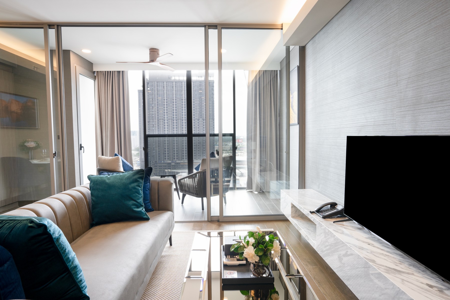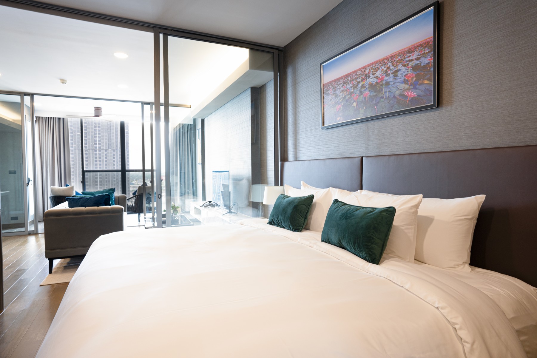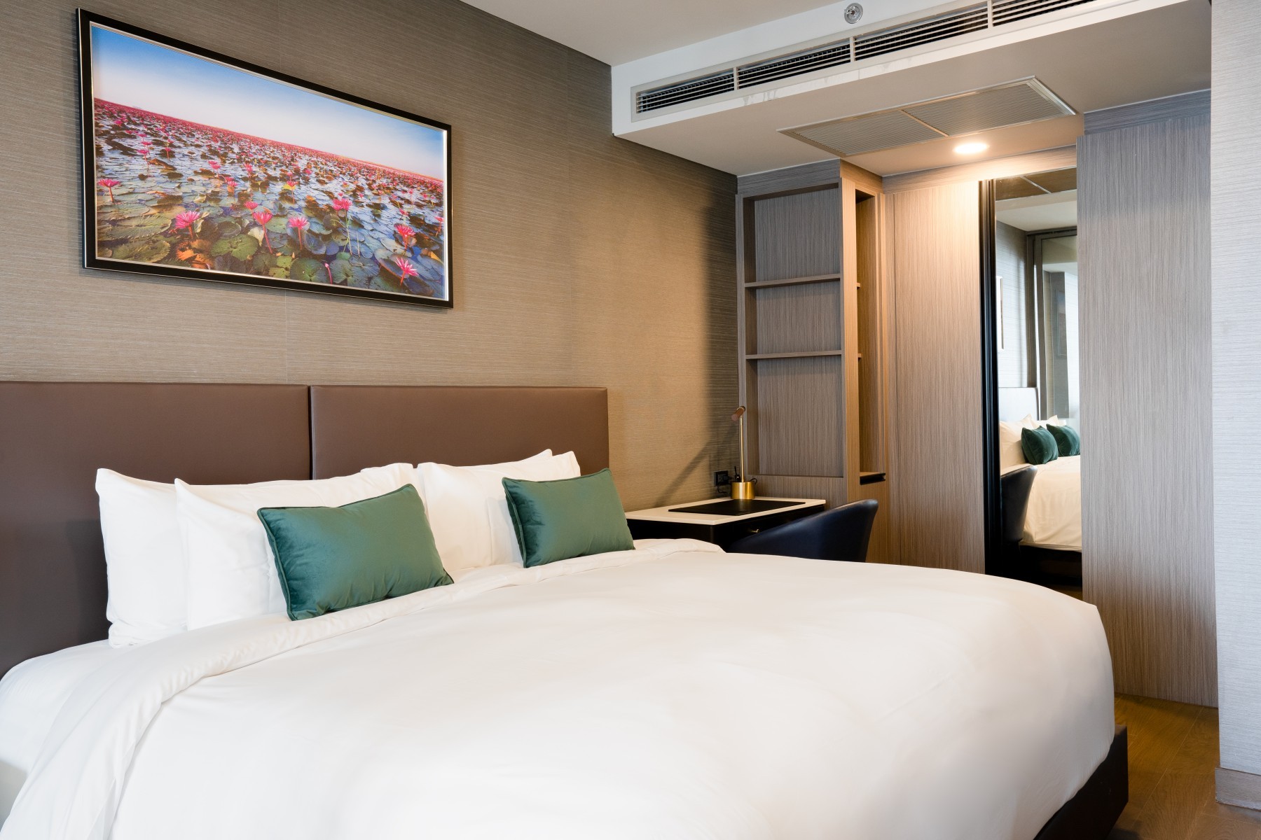 With contemporary Thai design and signature touches like plush WynRest® bedding and complimentary bath products, our non-smoking Deluxe King room with one king bed creates the setting for a memorable stay. The comfortable, 58-square-metre space has a living area separate to the bedroom and features an ergonomic workspace. The city views are spectacular, and soundproofed windows ensure that your stay here is a tranquil one. The bathroom has a rain shower, bidet, robes, and hair dryer. Enjoy the convenience of an in-room washer and fully equipped kitchenette, including a refrigerator, coffee/tea maker, microwave, stove, and dining table, and stay connected with free high-speed Wi-Fi and a 55-inch smart LCD TV. Additional amenities are a minibar, laptop-size safe, cellphone charger, ironing facilities, and bottled water. We support green initiatives with our in-room recycling program.