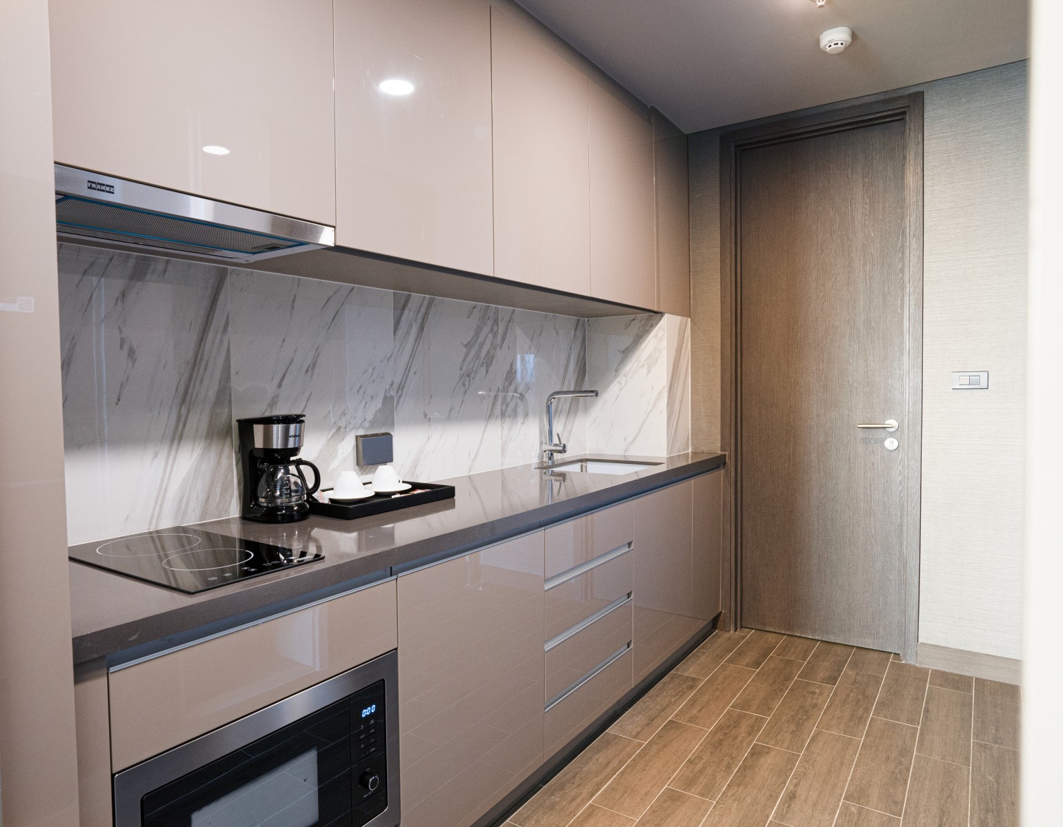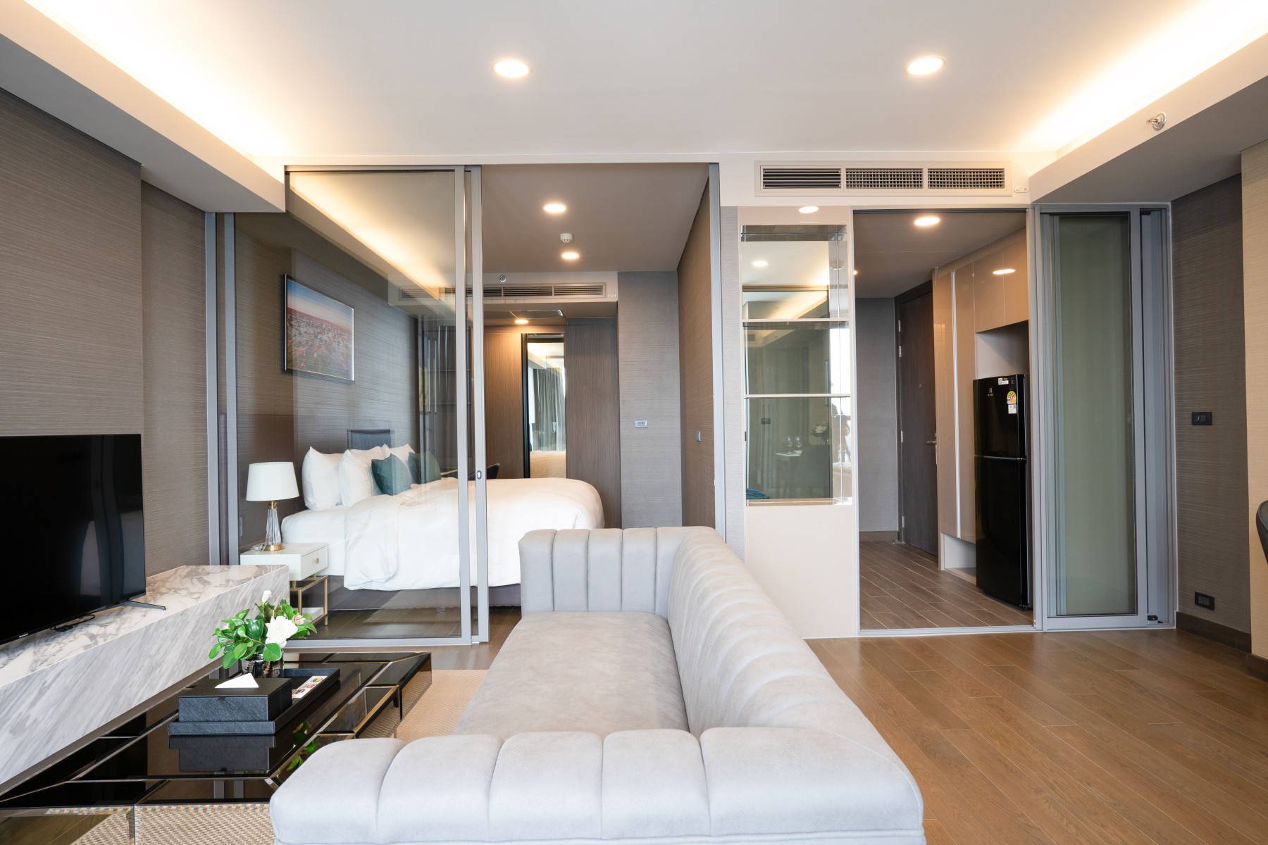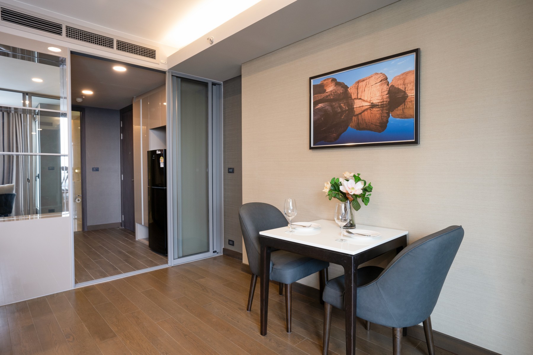 With contemporary Thai design and signature touches like plush WynRest® bedding and complimentary bath products, our non-smoking Deluxe King room with one king bed creates the setting for a memorable stay. The comfortable, 58-square-metre space has a living area separate to the bedroom and features an ergonomic workspace. The city views are spectacular, and soundproofed windows ensure that your stay here is a tranquil one. The bathroom has a rain shower, bidet, robes, and hair dryer. Enjoy the convenience of an in-room washer and fully equipped kitchenette, including a refrigerator, coffee/tea maker, microwave, stove, and dining table, and stay connected with free high-speed Wi-Fi and a 55-inch smart LCD TV. Additional amenities are a minibar, laptop-size safe, cellphone charger, ironing facilities, and bottled water. We support green initiatives with our in-room recycling program.